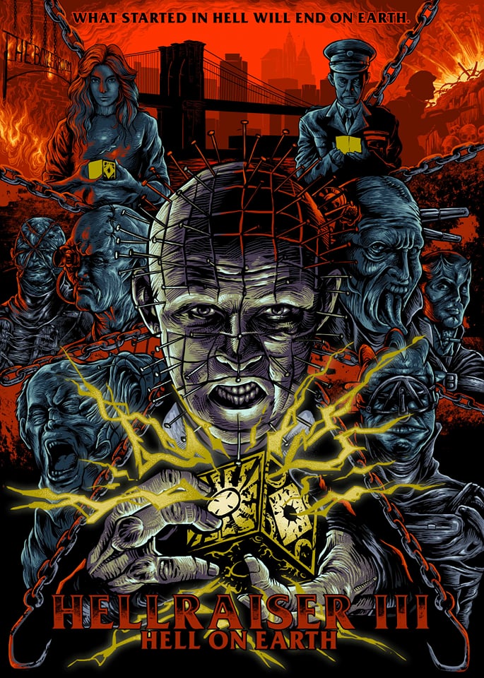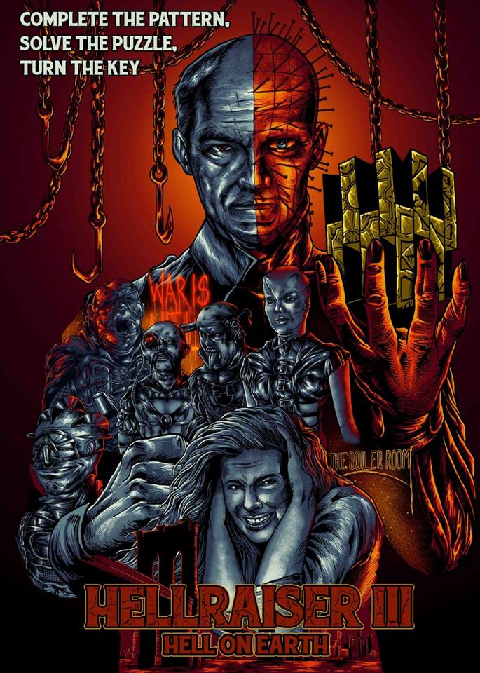 Danny Stewart has recently been working with Mad Matt Design to commission these amazing Hellraiser III: Hell on Earth posters. He’s been sending us images of the different stages of completion and as you can see, they certainly have a striking design and composition.