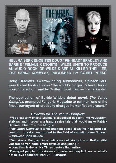 New Audio Version of Barbie Wilde’s The Venus Complex out now, Narrated by Doug Bradley! That was a long title, but this amazing novel deserves it. It’s available on Audible, and Doug Bradley has an amazing range and is a spectacular narrator. If you want to hear some of his other audio books, check out Mister B Gone or Tonight Again. We talked with Barbie Wilde all the way back in episode 26 about this book, and we’re thrilled to see it’s now narrated by Pinhead himself.