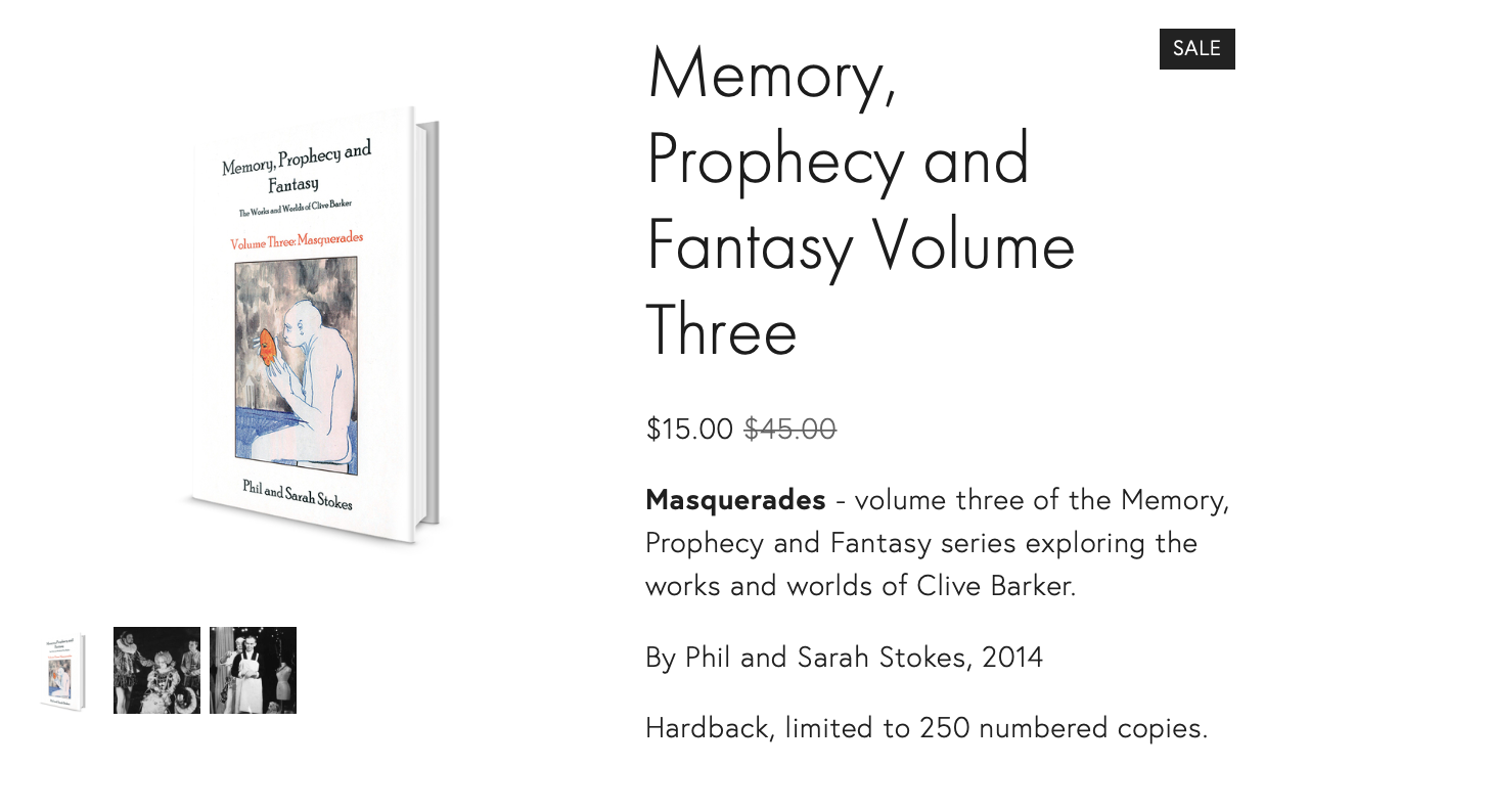 First, we have the Clive Barker Archive. Phil and Sara have set up a Black Friday weekend sale that’s good all the way until Monday night (11/26/18) at midnight, so check it out! In the sale you can get a Death’s Head A3 poster for $6.00, a Nightbreed screening poster from the premier of the Director’s Cut for $15.00, Imaginer 3,4, and 5 for $80.00. And the most amazing deal, Memory Prophecy and Fantasy Volume 3 is $15.00 (previously $45!). Also on sale, Notebook bundles $1.00 off. We hope you take advantage of this sale before it’s gone. I’ve got my eye on Imaginer 5, myself. And If I didn’t already have Memory, Prophecy and Fantasy Volume 3, I would be buying it right now before I finish this article.